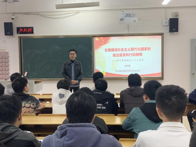 林宇霞老师从历次党代会的共同点、二十大的会议准备工作、二十大报告的主要内容、二十大的重大理论创新、二十大的20个亮点和学习贯彻二十大精神等六个方面,对党的二十大精神进行了全面系统深入的宣讲解读。宣讲将党的二十大报告中的新观点、新论断、新思想做出梳理和阐释,从表及里、由浅入深地分析报告内容的重大政治意义、理论意义、实践意义。林老师表示,在当前和今后一个时期,员工党员要把学习宣传贯彻党的二十大精神作为首要政治任务,迅速在班级和寝室掀起学习宣传贯彻热潮,坚决当好“两个确立”的忠诚拥护者和“两个维护”的坚定实践者。
