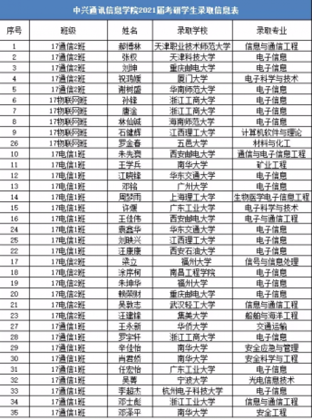 据统计,中兴学院有67名同学投身考研,上线人数41人,上线率达61%,录取人数36人,录取率达54%。其中多数同学被厦门大学、华南师范大学、福州大学、西安邮电大学、广东工业大学等985、211、双一流等知名高校录取。并再次出现5人全部成功考研的“学霸”宿舍。另外,17级电子信息工程2班朱坤华同学以411分的高分被福州大学录取。
