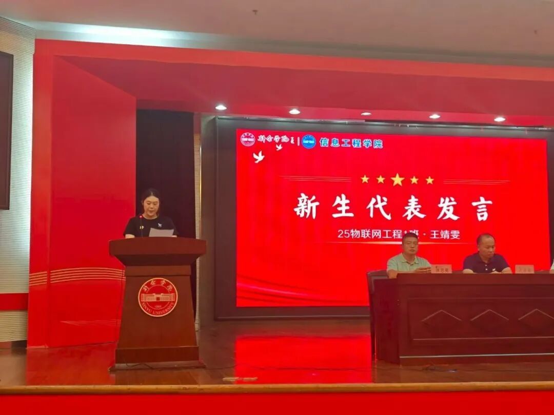 新生代表25级物联网1班的王靖雯同学则以充满朝气的发言,表达了对老员工活的美好憧憬与热烈期待。她将这份期待扎根于对专业学习的初步认识,也延伸至对自我成长、人际交往和社团实践的向往之中。她表示,虽刚踏入校园,却感受到温暖的集体环境,在未来四年中将踏实学习、勇于探索、广交挚友,不负青春时光。