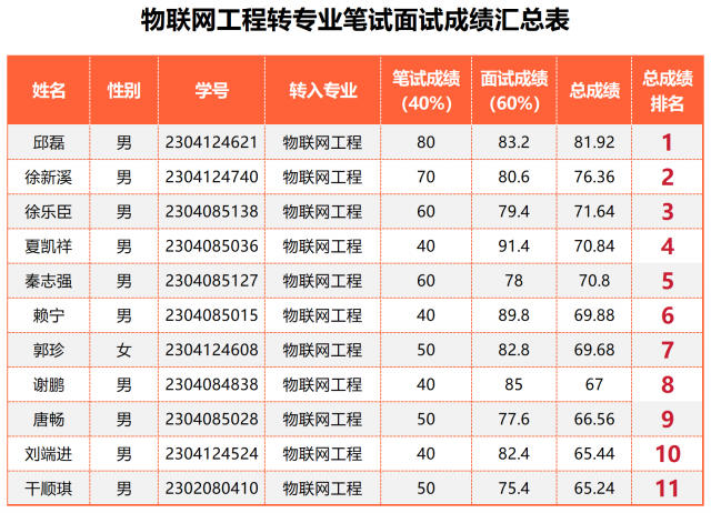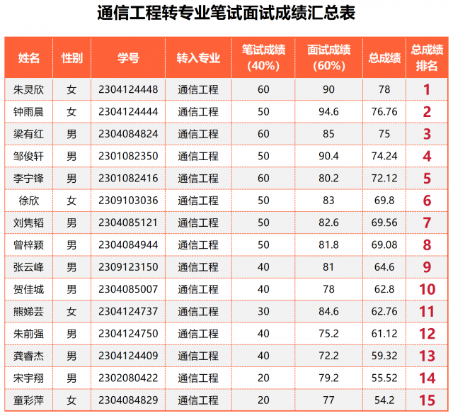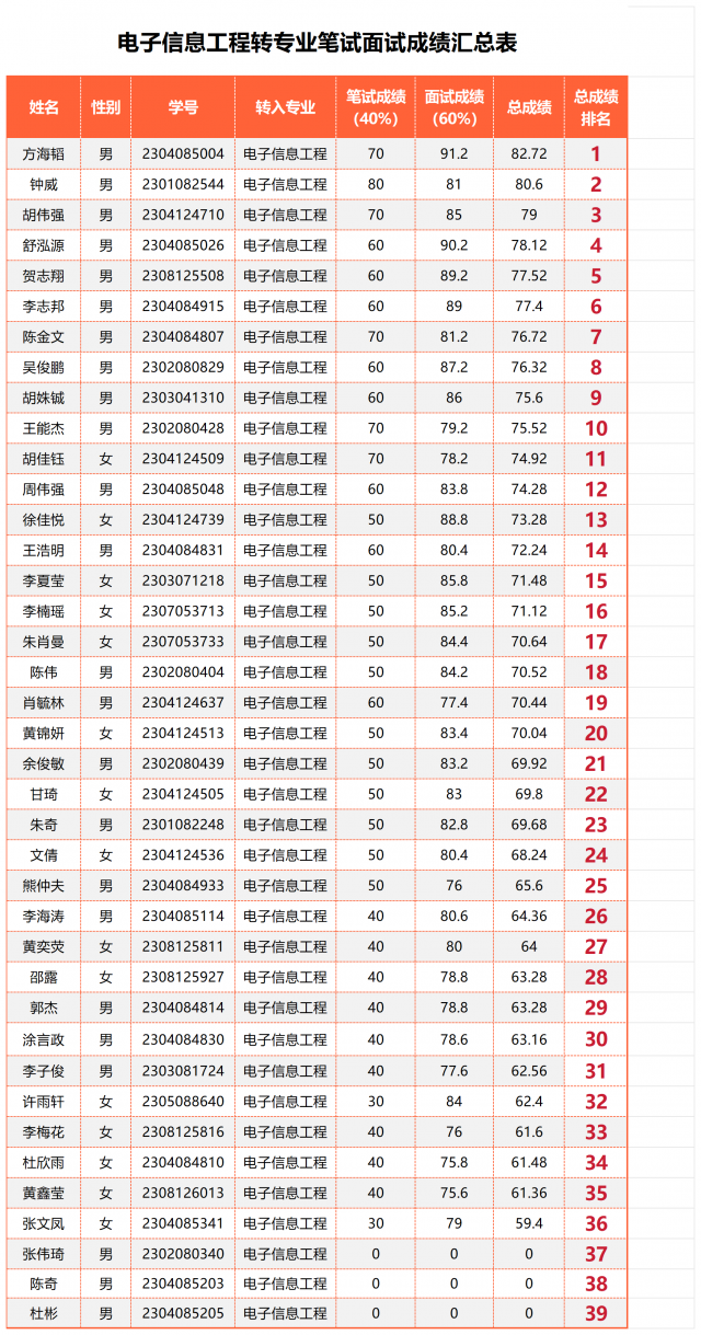 根据《中兴通讯信息学院2023级本科生转专业工作方案》,学院精心组织,严格执行转专业流程和各环节,确保转专业过程的公平、公正、公开。现将2023年11月28日举行的转专业笔试及面试成绩予以公示,公示时间为:2023年11月30日至12月5日。公示期间如有异议,请及时向中兴通讯信息学院办公室反映,联系电话:0790-6667931。