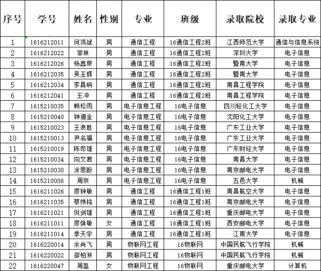 2020年全国硕士研究生录取工作已落下帷幕。中兴学院2020届毕业生考研成绩喜人。在中兴学院全体师生的共同努力下,共有22名同学分别被暨南大学、江南大学、南昌大学、深圳大学、广东工业大学、南京邮电大学、西安邮电大学等16所高校正式录取。
