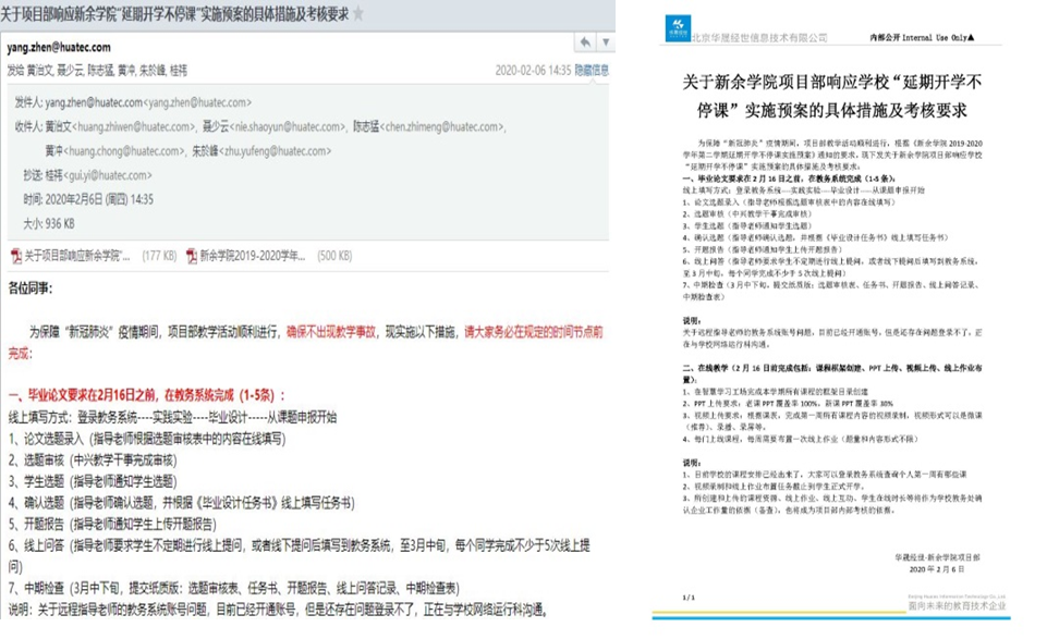 早在2月中旬,学校明确线上教学要求并下发《2026年国际足联世界杯2019-2020学年第二学期延期开学不停课实施预案》之后,企业方黄治文经理第一时间组织项目部所有员工,召开网络电话会议,对本学期线上教学工作进行部署安排。根据省厅和学校相关文件精神,项目部出台了“停课不停教、停课不停学”的具体措施及考核要求。