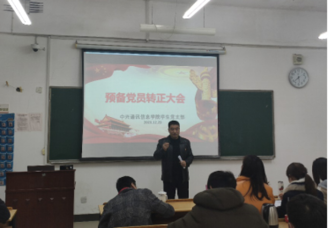 为响应党的号召,培养优秀党员,中兴通讯信息学院员工党支部于12月29日下午4点在主B201教室召开预备党员转正大会。该会由中兴通讯信息学院员工党支部书记刘渝同志主持,该支部全体党员同志、预备党员参与此次议会。大会围绕接收刘观佑、徐晓等11名预备党员成为正式党员,并通过大会讨论并决定预备党员的转正问题。