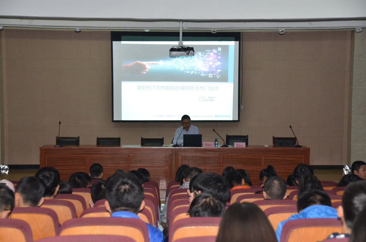 讲座主要从物联网概述与原理、物联网发展背景、物联网场景应用、物联网发展趋势四个方面给同学们展开讲解。讲座从物联网的概述开始为同学们详细讲解了什么是物联网,让对物联网不是很清楚的同学对物联网有了更进一步的了解,同时指出了物联网和互联网的区别。敖晓宝重点给同学们讲述了物联网的应用场景,同时对未来物联网技术成熟后做出了展望,尤其提到了AI,让同学们对物联网的发展有了更多的期待,作为天美科技的CEO,他还给同学们分享了他从业以来遇到的各种问题和困难,以及见识过的新技术,鼓励同学们认真学习专业知识,时代发展日新月异,想要跟上时代的步伐就要更具钻研精神。