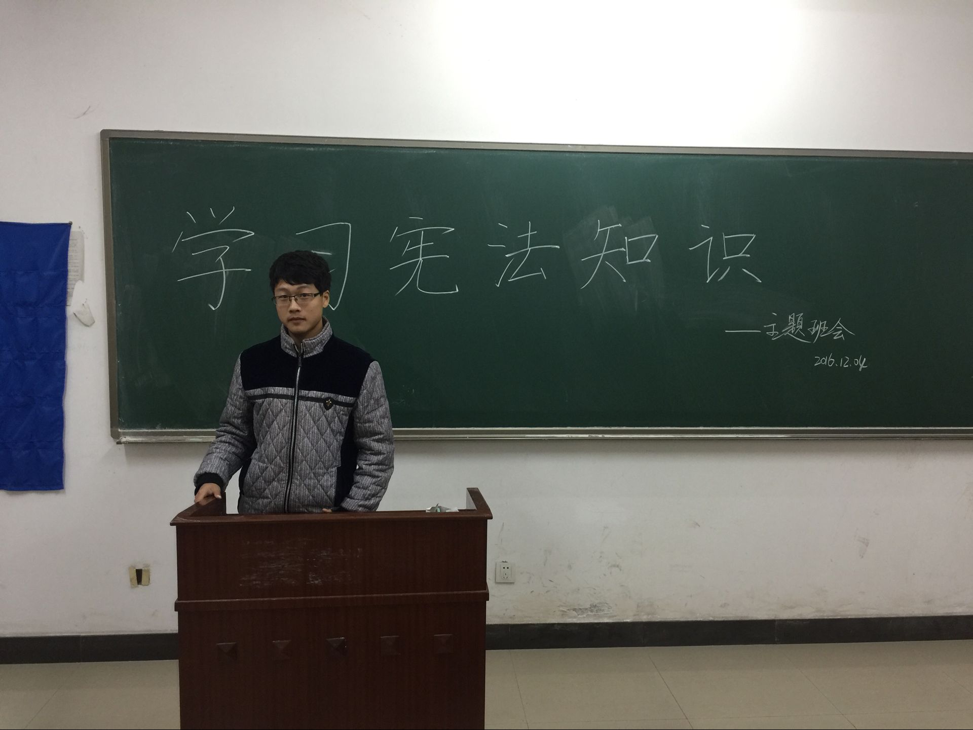 本次班会由各班班长主持召开,班长首先向同学们说明本次主题班会的主要内容并介绍了宪法对于老员工的意义。班长还提前准备了二十道有关宪法知识的选择题,让同学们现场进行抢答。抢答环节让同学们对宪法有了更深入的了解,并产生主动去了解宪法的动力。同学们还积极主动的谈了自己对宪法的了解,例举几个案例说明了宪法的重要性。活动最后,由团支书进行活动总结并呼吁同学们行动起来,共建法制校园,法制社会。