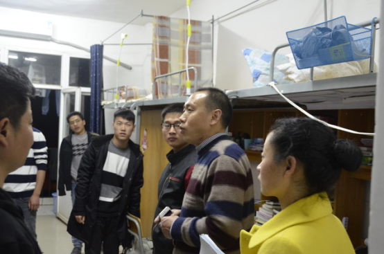 熊经理一行人首先来到了13栋男生宿舍,他认真地询问同学们的寒假的生活情况,并且品尝了部分同学家长的美食,这不仅让同学们感受到了格外的亲切,而且增进师生之情。在大四同学们的寝室中,熊经理不仅关切的询问生活情况,更在交谈中积极的为大家排忧解难,解答了同学们在未来职业道路上选择的疑惑。在离开前,熊经理向师生代表提出了今后工作的要点以及自己的一些想法,谈话在欢声笑语中进行,气氛十分融洽。