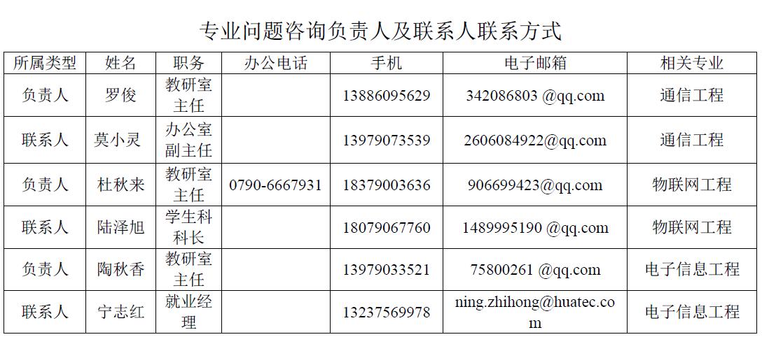 专业问题咨询负责人及联系人联系方式